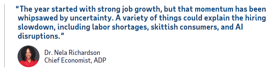 - Leisure and hospitality and construction performed well despite a broader month-over-month slowdown in hiring.