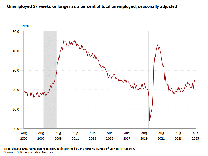 It is becoming more difficult to find a job. At this point, 25.7% of those unemployed have been unemployed for 27 weeks or longer, up from 24.9% last month.