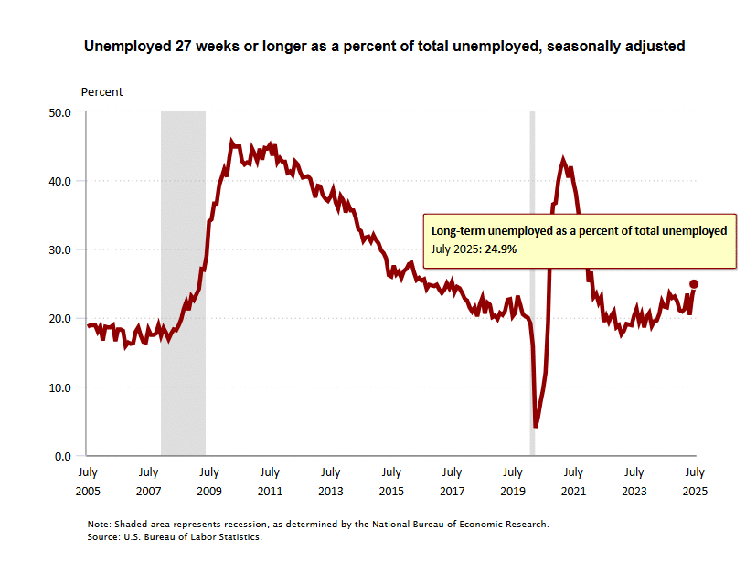 At this point, 24.9% of those unemployed have been unemployed for 27 weeks or longer.