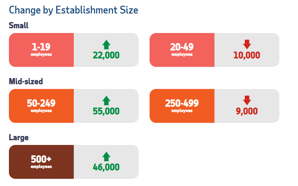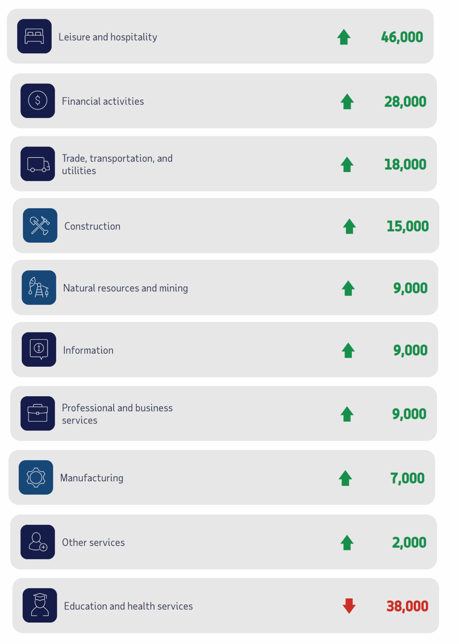 - Hiring gains were led by a resurgence in services, with the exception of education and health, which has posted a net loss of jobs so far this year.